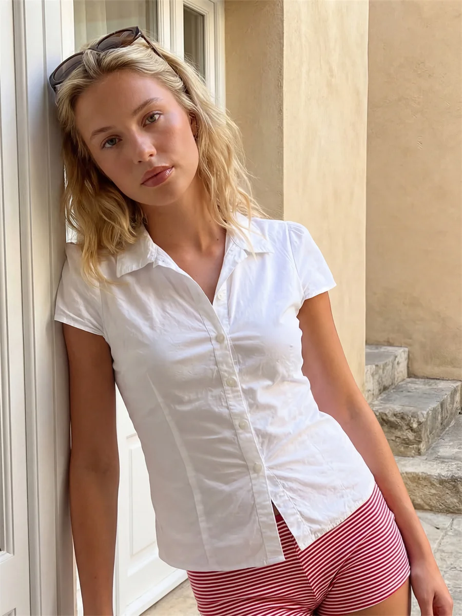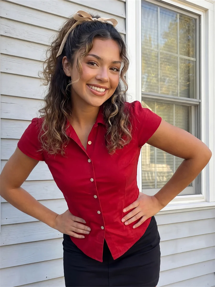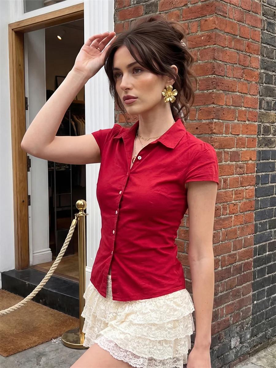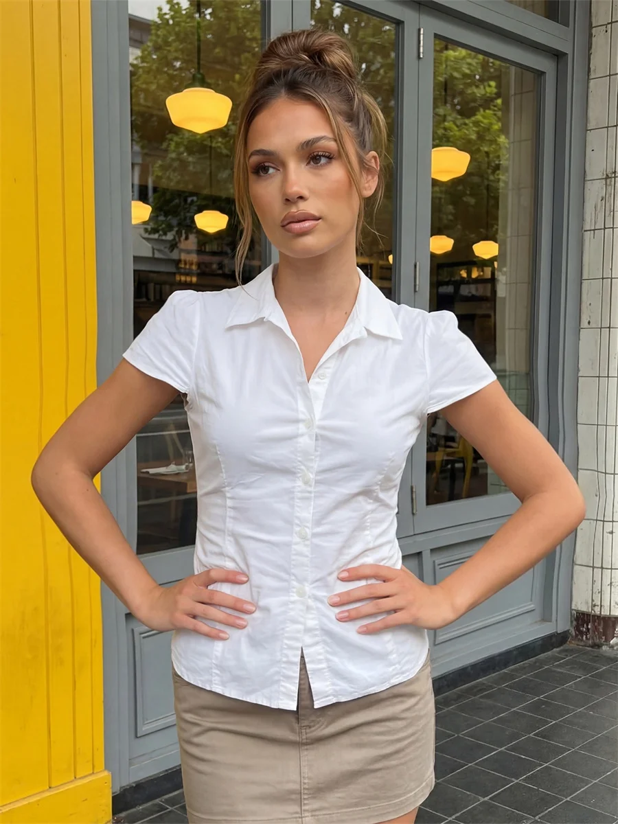 Women’s Summer Slim Fit Shirt Solid Color Short Puff Sleeve Lapel Button Down Ruched Tops Streetwear