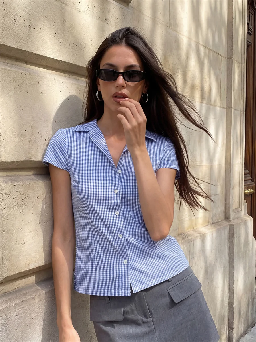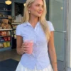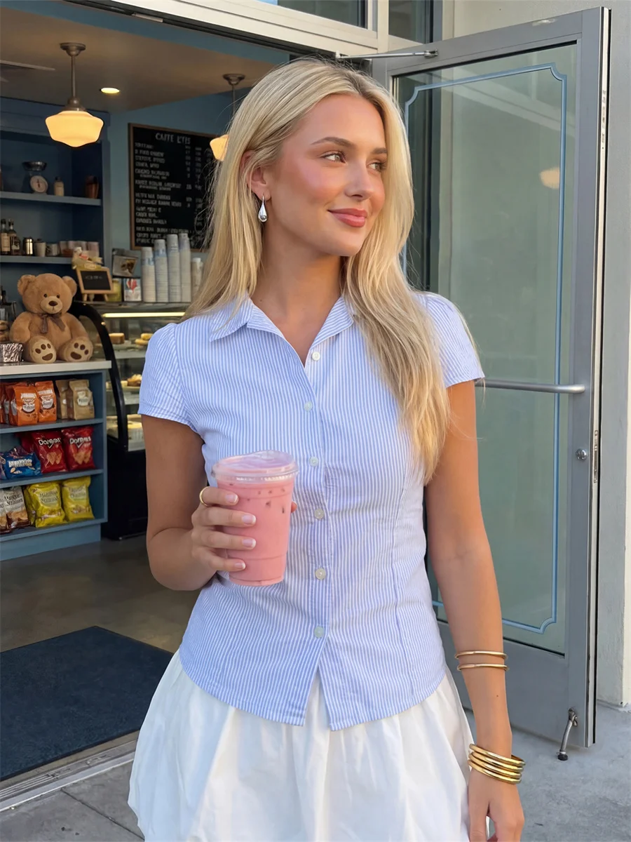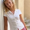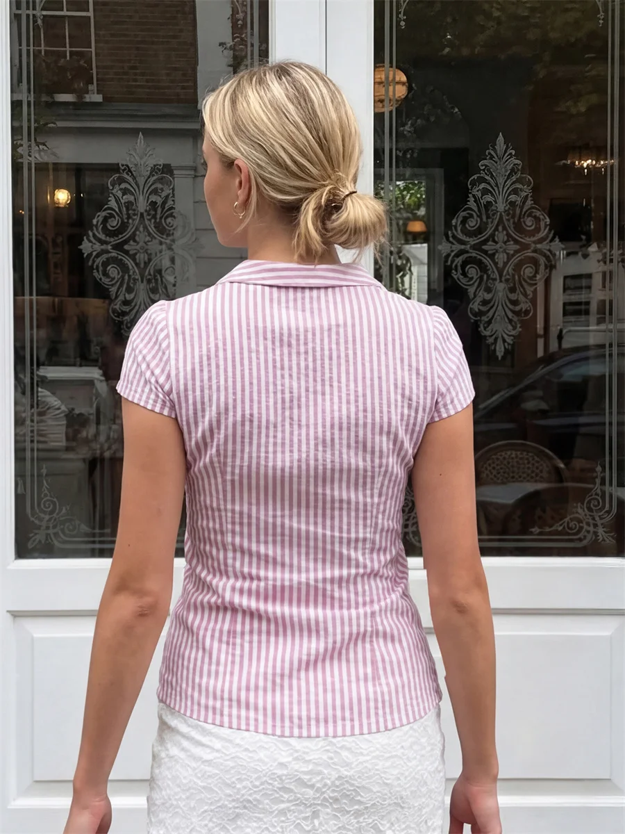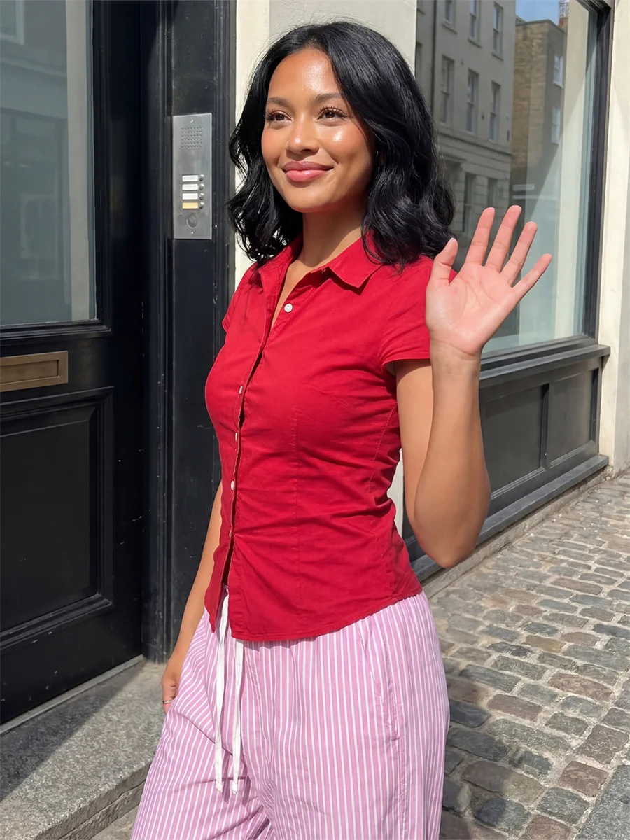 Women’s Summer Slim Fit Shirt Solid Color Short Puff Sleeve Lapel Button Down Ruched Tops Streetwear
